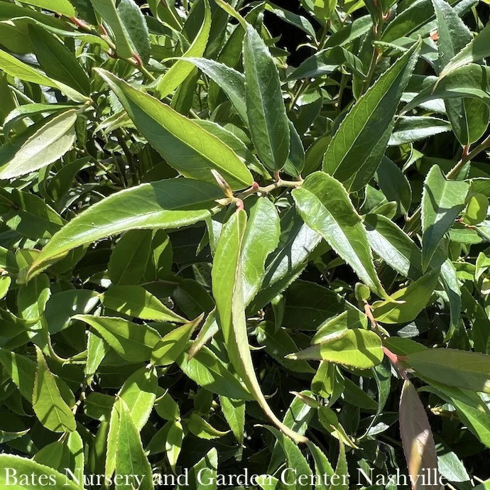 FOLIAGE: Evergreen; Glossy green leaves that are red when new and colorful in the fall